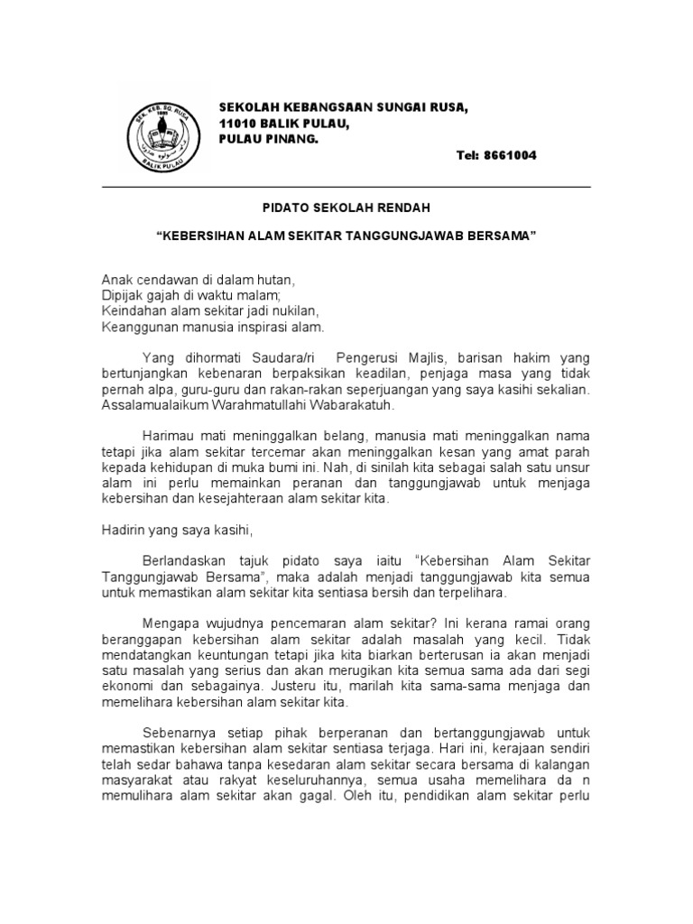 Teks Pidato Penjagaan Alam Sekitar Tanggungjawab Bersama
