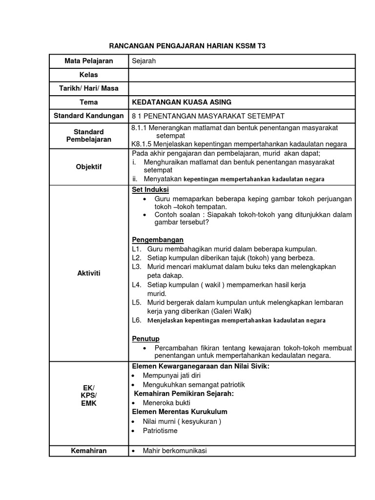 Rancangan Pengajaran Harian Kssm T3 8 1 Docx