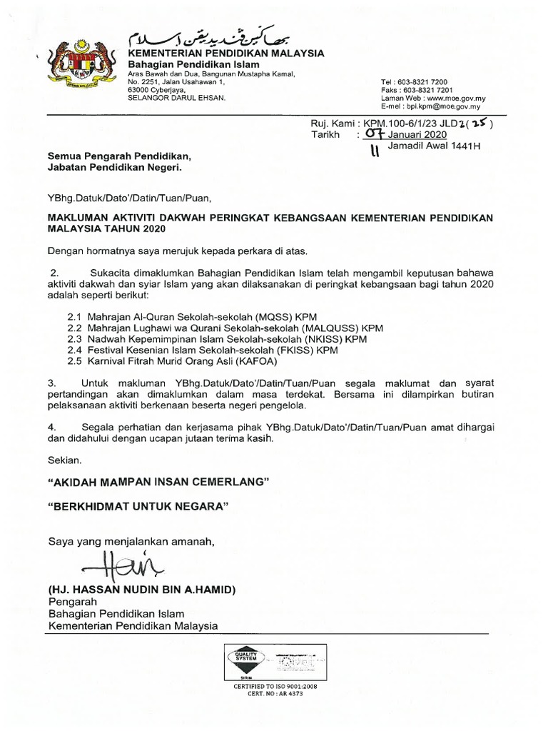 Surat Makluman Bulan Dakwah Sekolah Sekolah Kpm 2016