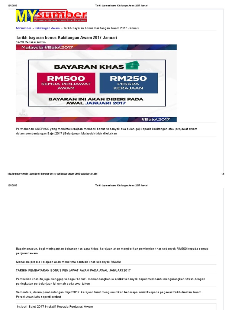 Tarikh Bayaran Bonus Kakitangan Awam 2017 Januari