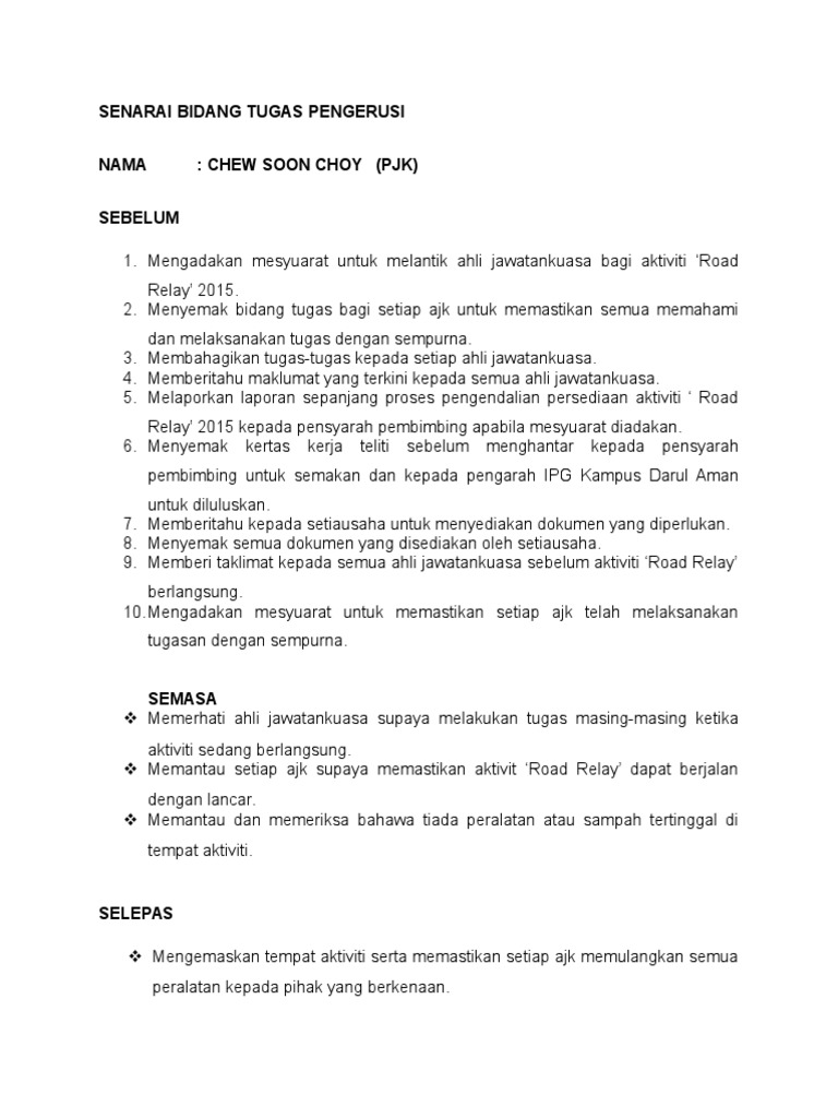 Senarai Bidang Tugas Ahli Jawatankuasa