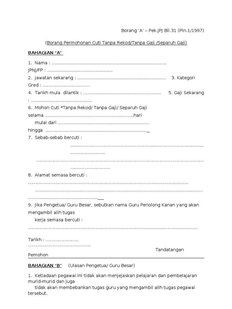 Borang Cuti Tanpa Rekod Separuh Gaji Tanpa Gaj Doc Document
