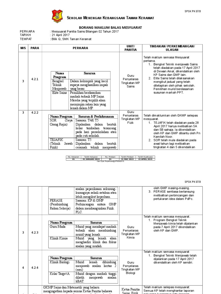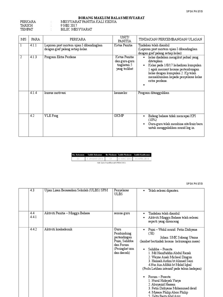 Smkv pm 07 lampiran 4 rekod edaran surat edaran minit mesyuarat maklum balas. Pk 08 1 biodata gbk. Borang maklum balas minit mesyuarat 1. No keluaran tarikh keluaran no pindaan tarikh pindaan tarikh berkuatkuasa 06 01 disember 2016 0 0 3 januari 2017 pk15 1.