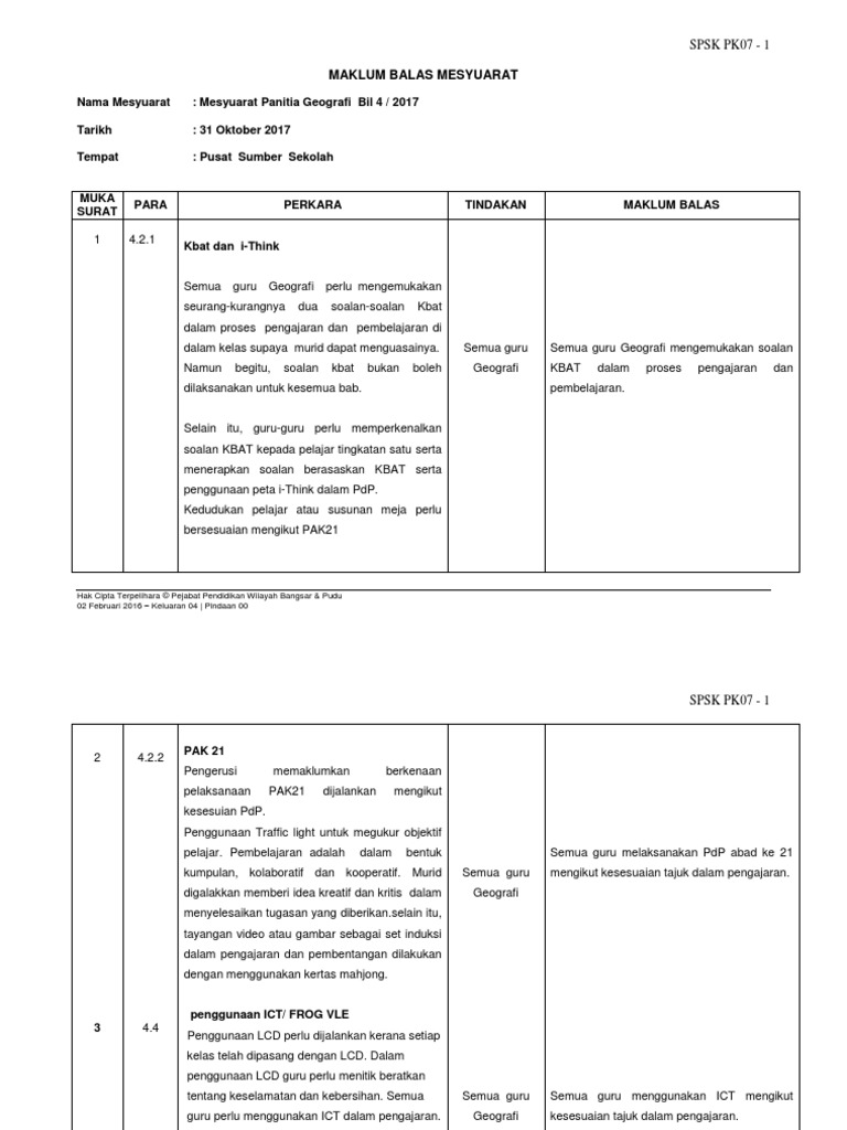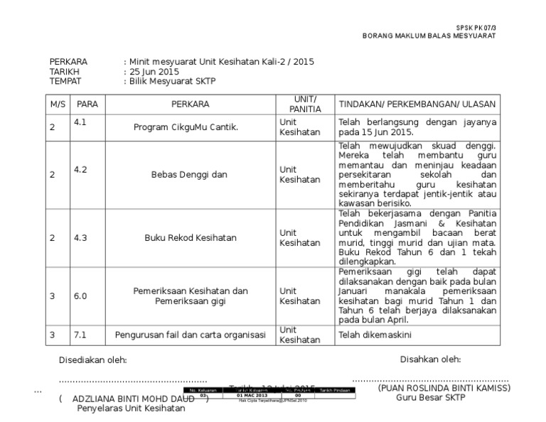 Borang pk 07 2 senarai kehadiran mesyuarat doc. Pk 08 7 borang. Maklum balas minit mesyuarat tarikh. Muka surat para perkara tindakan maklum balas disediakan oleh.