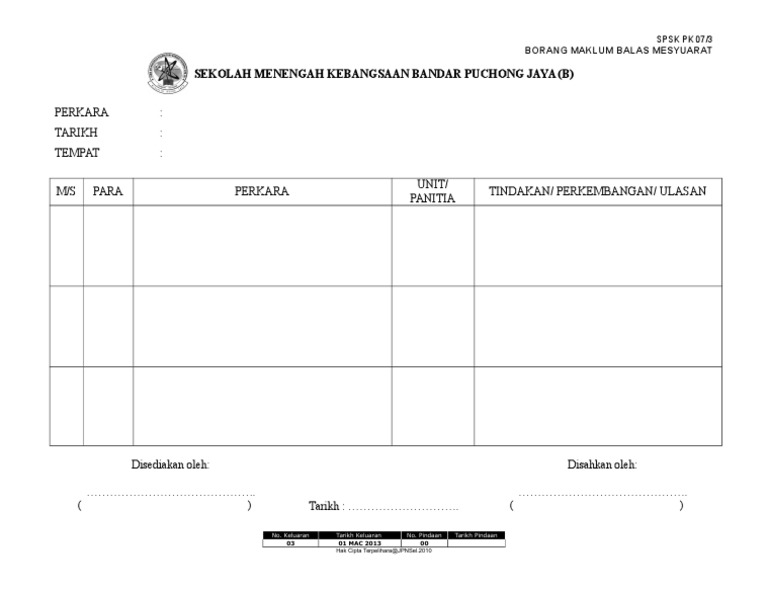 Pk07 3 Borang Maklum Balas Doc Spsk Pk 07 3 Perkara Tarikh Tempat M S Para Disediakan Oleh Urus Setia Mesyuarat U2026 U2026 U2026 U2026 U2026 U2026 Tarikh Borang Course Hero