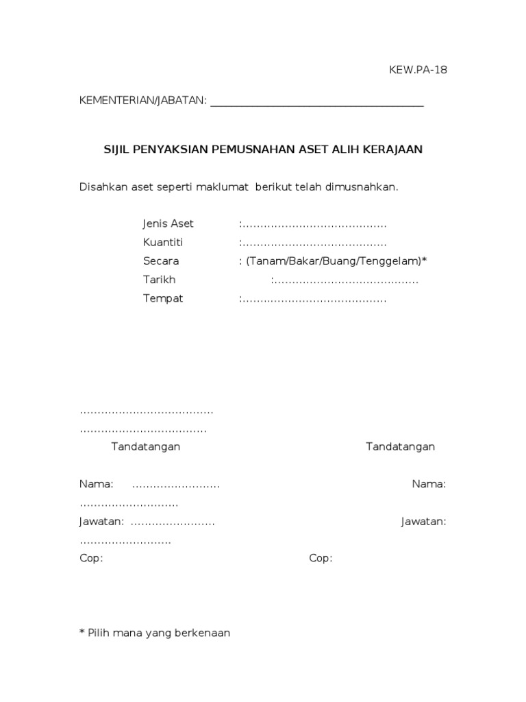 Kew Pa 18 Sijil Penyaksian Pemusnahan Aset Alih