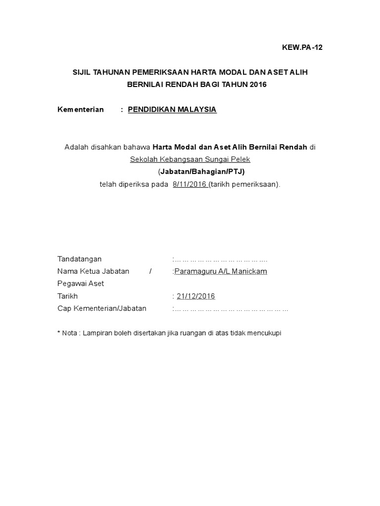 2 Lampiran Kew Pa 12 Sijil Tahunan Pemeriksaan Harta Modal Dan Aabr Doc