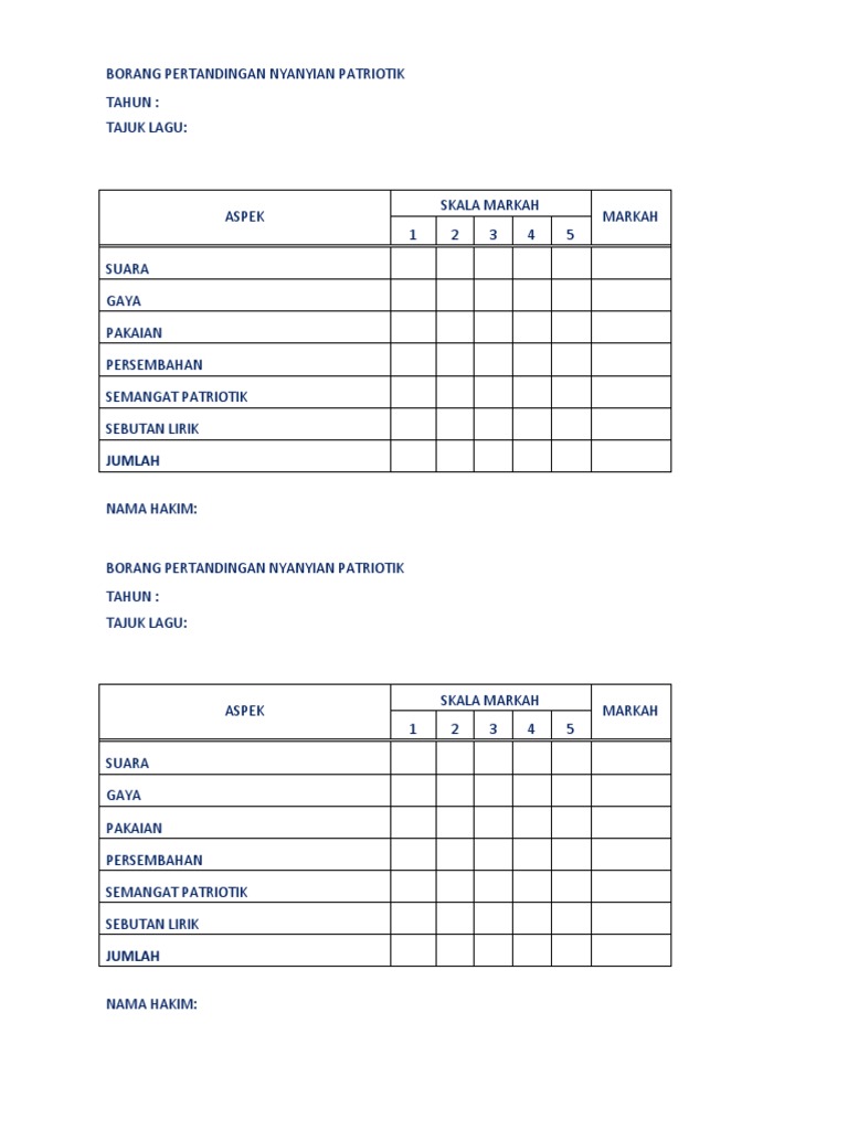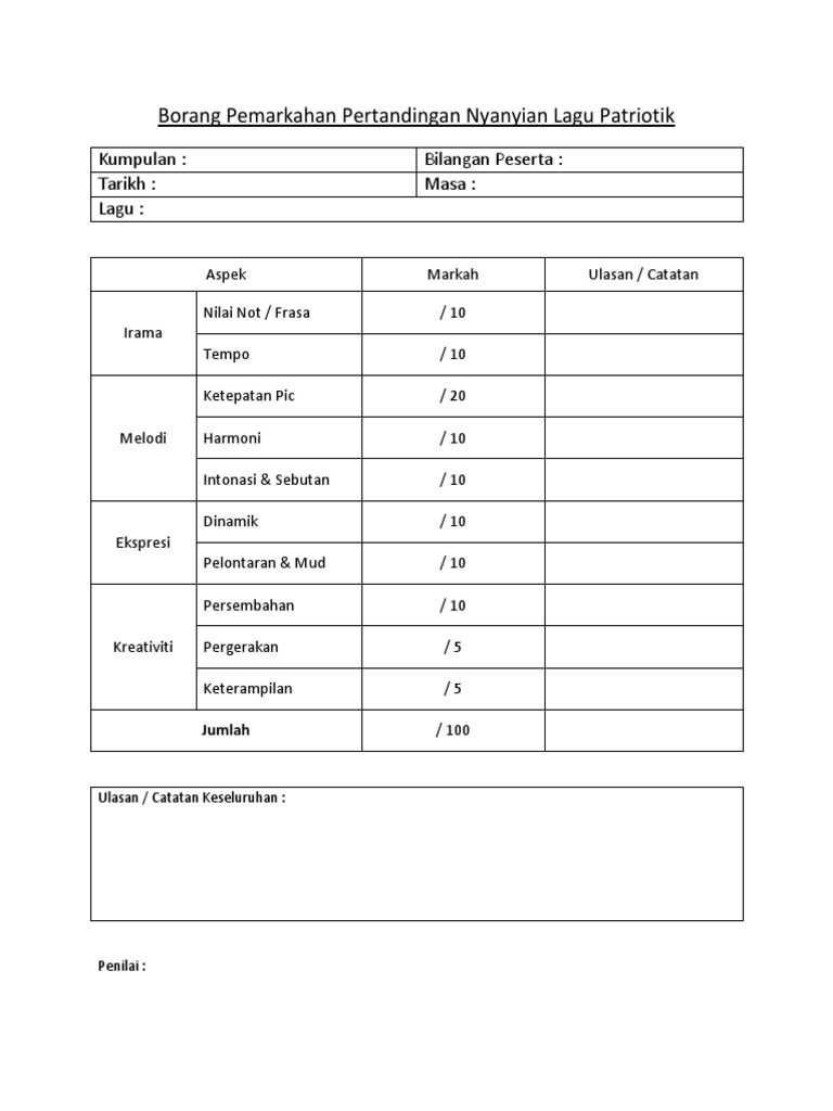 Borang Markah Pertandingan Nyanyian Lagu Patriotik