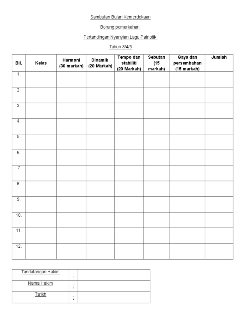Borang Pemarkahan Pertandingan Nyanyian Lagu Patriotik Bulan Kebangsaan Hari Malaysia Sk Entubuh 2019