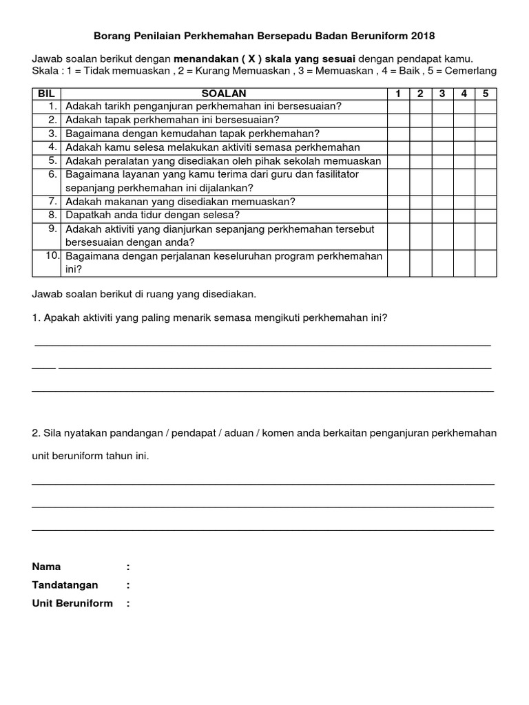 Borang Penilaian Perkhemahan Bersepadu Badan Beruniform 2018