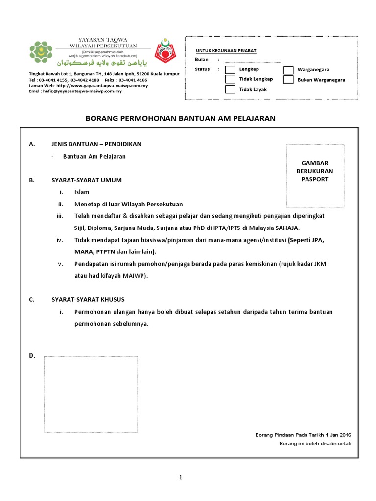 Borang Permohonan Bantuan Zakat Pengajian Sarjana Dan Doktor Falsafah 2016