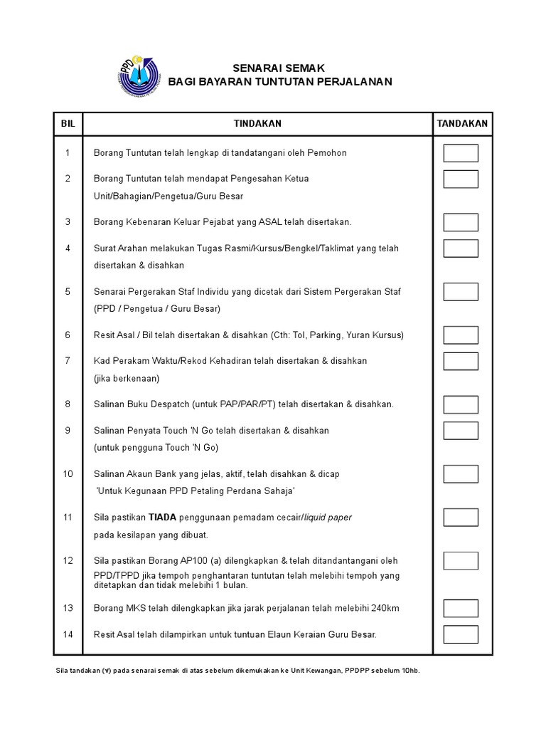Senarai Semak Bagi Bayaran Tuntutan Perjalanan Bil Tindakan Tandakan