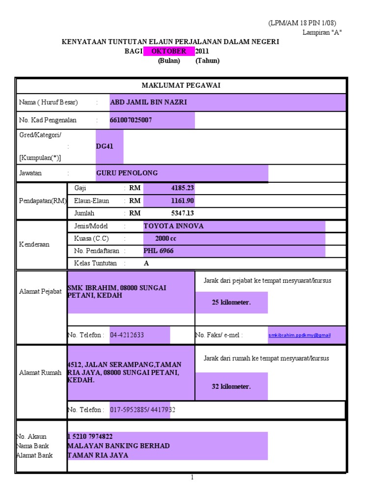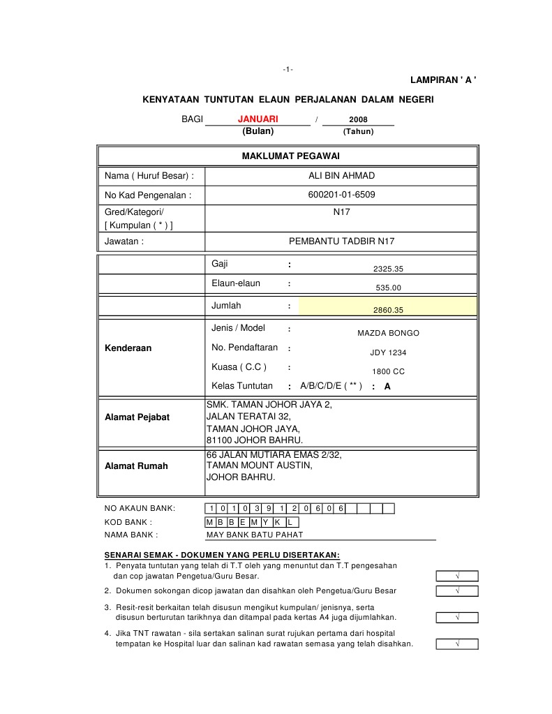 Borang Tuntutan Elaun Perjalanan Dalam Negeri Guru Apdm Kehadiran