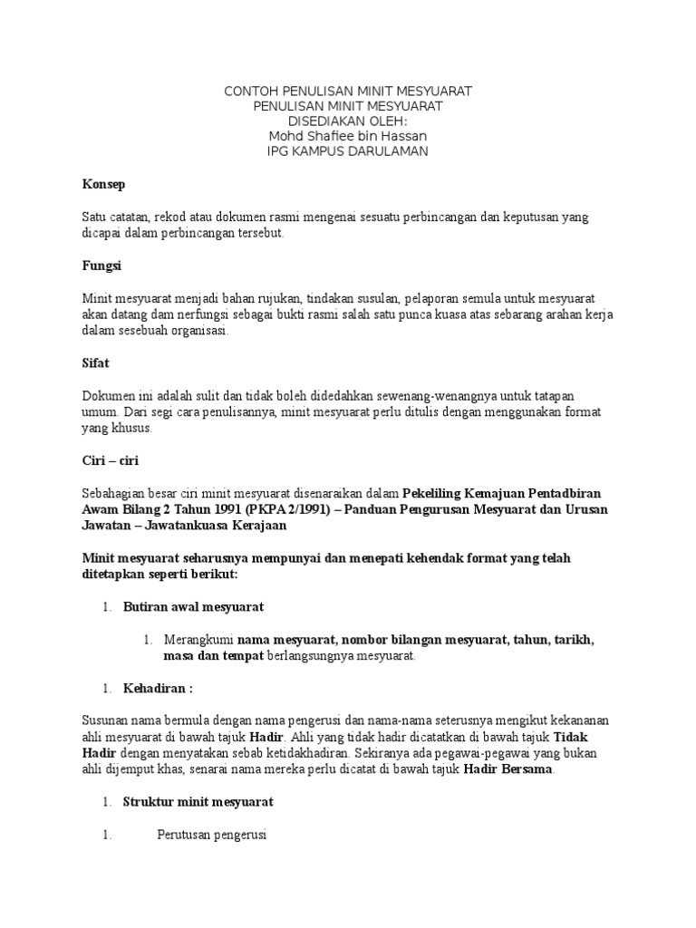 Contoh Penulisan Minit Mesyuarat Doc Document