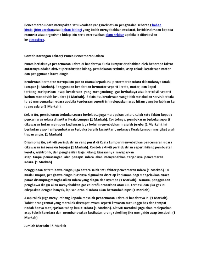 Kesan kesan pencemaran udara kepada manusia dan alam sekitar. Indeks pencemaran udara malaysia ipum telah menunjukkan bahawa kualiti udara di negeri selangor pada tahun 2000 bukan sahaja berada pada tahap tidak sihat tetapi juga sangat tidak sihat sepanjang tahun tersebut i. Contoh karangan kesan pencemaran udara tugasan geografi pt3. Tidak dapat dinafikan bahawa pembangunan adalah amat penting untuk kemajuan sesebuah negara.