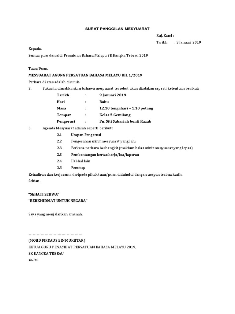 Contoh Surat Panggilan Mesyuarat Agung Persatuan Bm