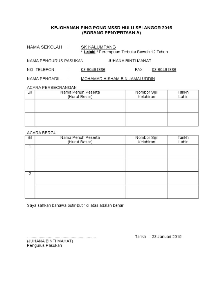 Borang Penyertaan Ping Pong 2015 Doc