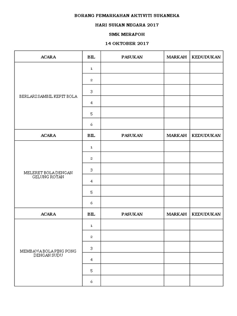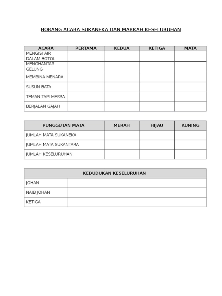 Borang Acara Sukaneka Dan Markah Keseluruhan
