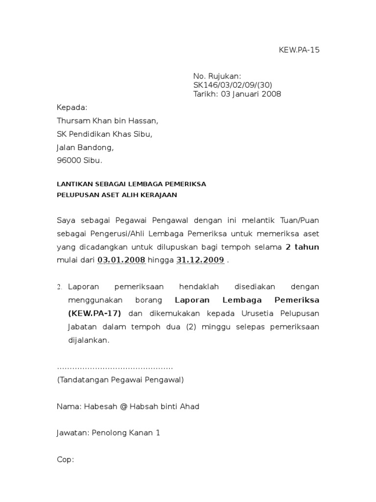 Kew 1 Pa 15 Surat Pelantikan Lembaga Pemeriksa Pelupusan Aset Alih