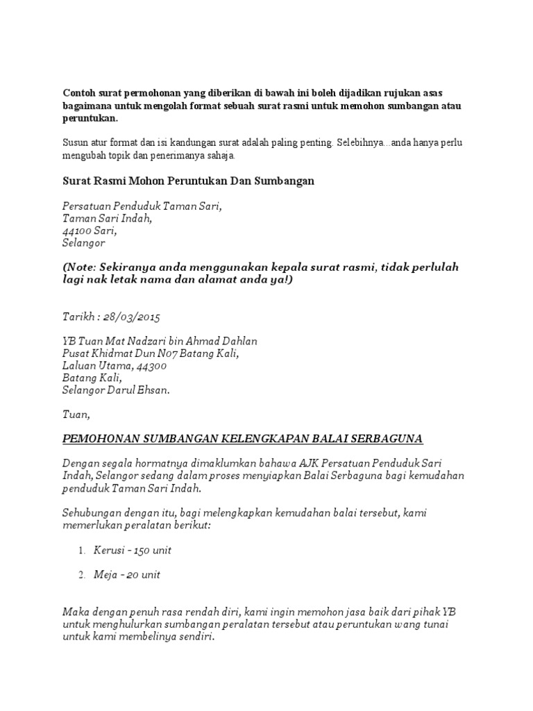 Contoh Surat Permohonan Yang Diberikan Di Bawah Ini Boleh Dijadikan Rujukan Asas Bagaimana Untuk Mengolah Format Sebuah Surat Rasmi Untuk Memohon Sumbangan Atau Peruntukan