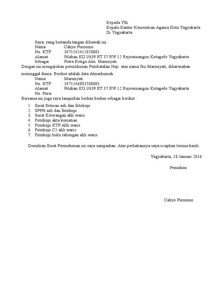 Surat Permohonan Pembatalan Haji Dari Ahli Waris Lamaran S