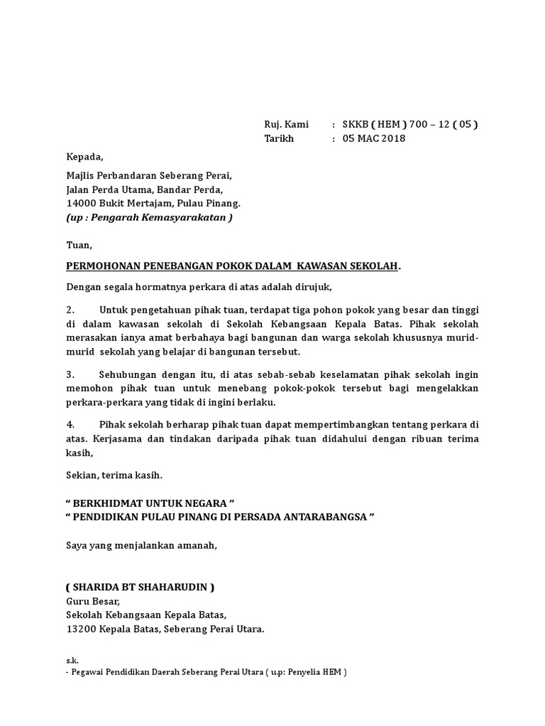 Contoh Surat Rasmi Permohonan Tebang Pokok