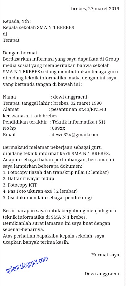 Contoh Surat Lamaran Kerja Guru Yang Baik Dan Benar Syilent