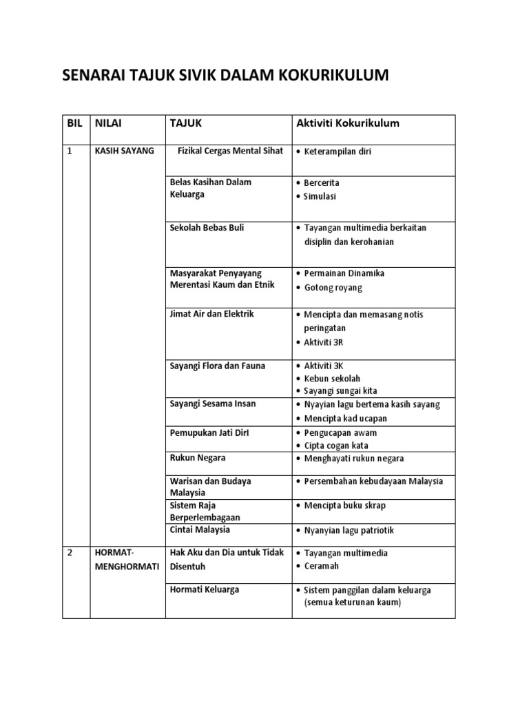 Senarai Tajuk Sivik Dalam Kokurikulum