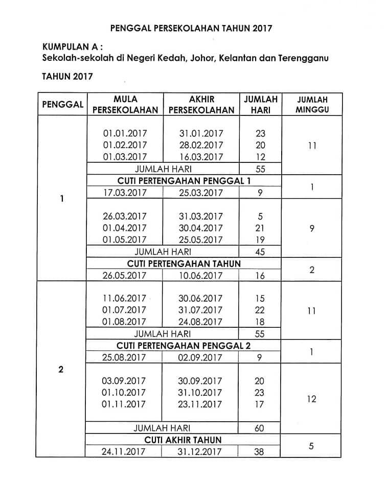 Tarikh Cuti Sekolah 2017 Kalendar Takwim Penggal Persekolahan As