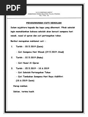 Makluman Cuti Pertengahan Tahun Cuti Perayaan Hari Raya Aidilfitri 2019 1440h Sk Taman Putra Perdana 2