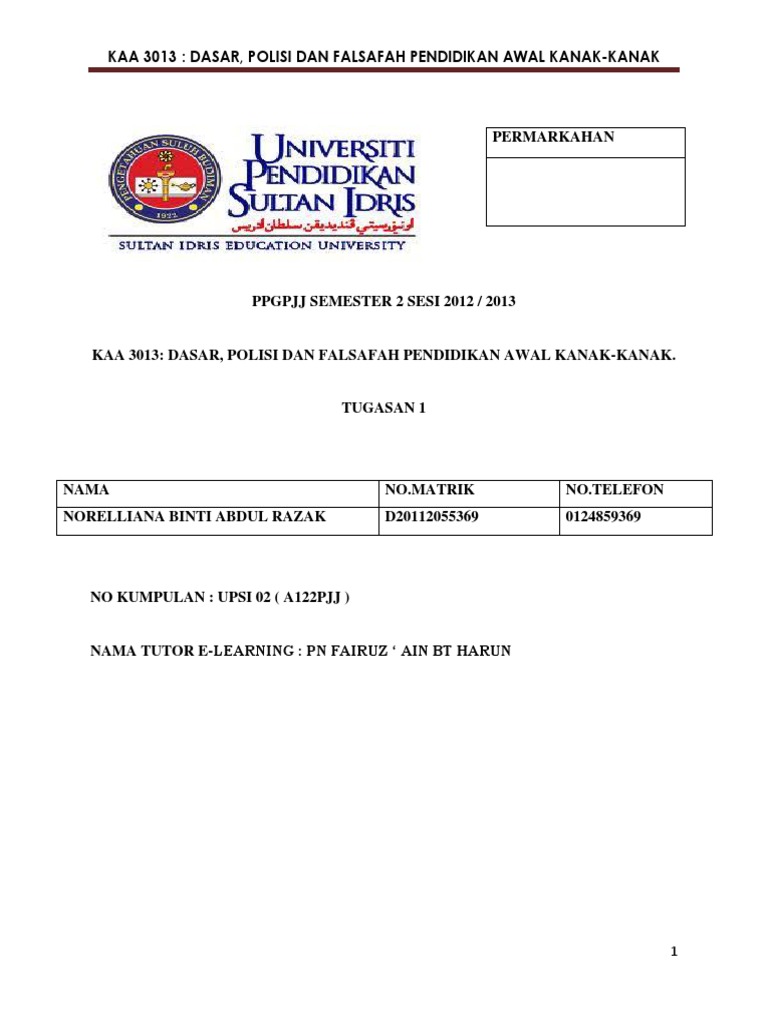 Kaa 3013 Dasar Polisi Dan Falsafah Pendidikan Awal Kanak Kanak Tugasan 1