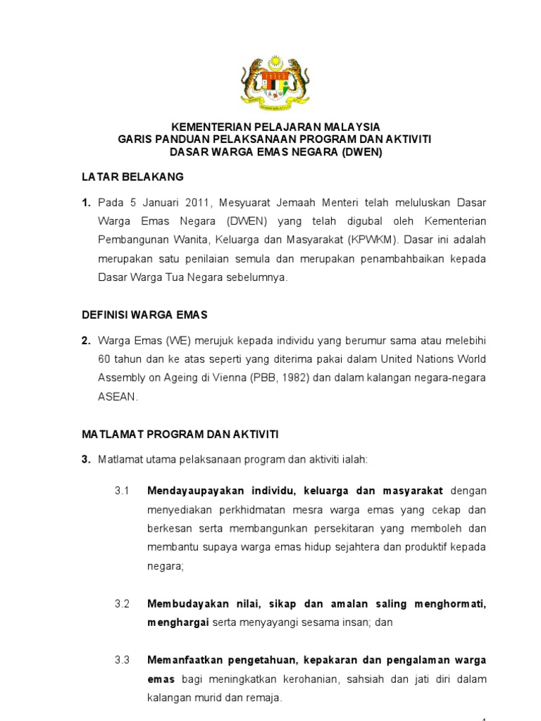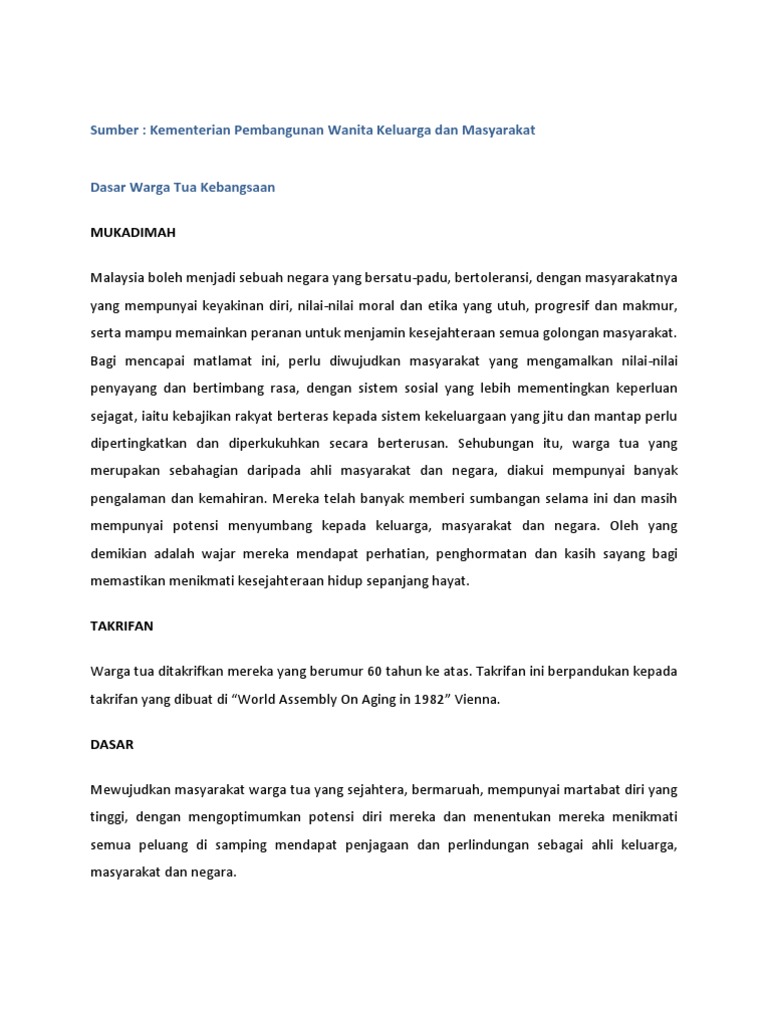 Dasar warga tua kebangsaan mukadimah malaysia boleh menjadi sebuah negara yang bersatu padu bertoleransi dengan masyarakatnya yang mempunyai keyakinan diri nilai nilai moral dan etika yang utuh progresif dan makmur serta mampu memainkan peranan untuk menjamin kesejahteraan semua golongan masyarakat. Dasar warga emas warga tua kebangsaan dasar warga tua kebangsaan. Sambutan hari warga emas kebangsaan diadakan pada 1hb oktober pada tiap tiap tahun sesuai dengan pengistiharan bangsa bangsa bersatu melalui.