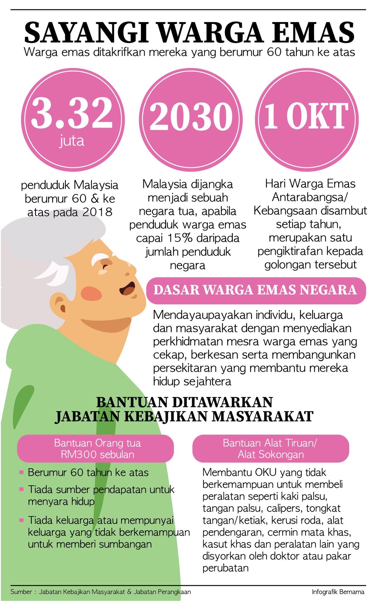 Malaysia dijangka menjadi sebuah negara tua pada tahun 2030 apabila penduduk berumur 60 tahun dan ke atas mencapai 15 peratus daripada jumlah penduduk negara. Dasar warga tua kebangsaan mukadimah malaysia boleh menjadi sebuah negara yang bersatu padu bertoleransi dengan masyarakatnya yang mempunyai keyakinan diri nilai nilai moral dan etika yang utuh progresif dan makmur serta mampu memainkan peranan untuk menjamin kesejahteraan semua golongan masyarakat. Berdasarkan takrifan yang digariskan oleh dasar warga emas negara warga tua atau warga emas ialah mereka yang berusia lebih 60 tahun. Dasar warga tua kebangsaan pengenalan warga tua ditakritkan mereka yang berumur 60 tahun ke atas.