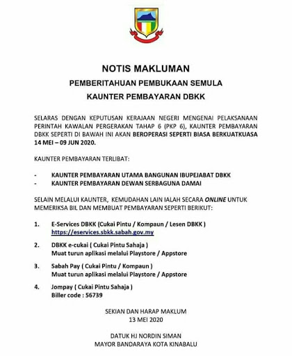 Notis Makluman Pemberitahuan Pembukaan Semula Kaunter Pembayaran Dbkk 14 Mei 9 Jun 2020