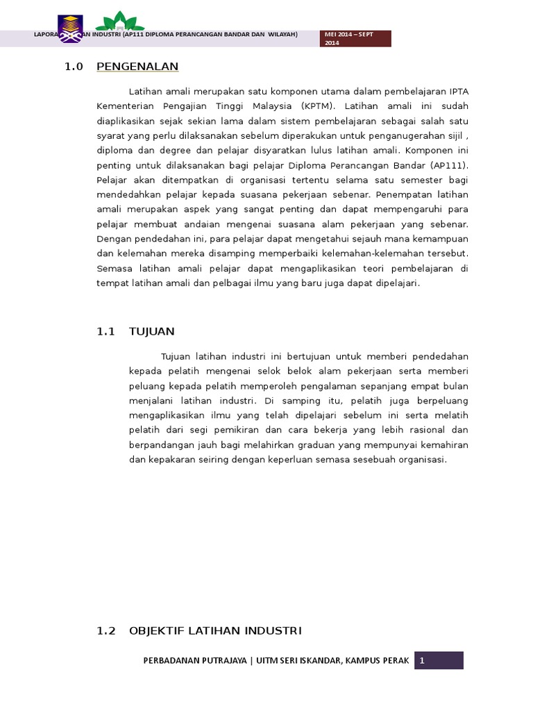1 0 Pengenalan Laporan Latihan Industri Ap111 Diploma Perancangan Bandar Dan Wilayah
