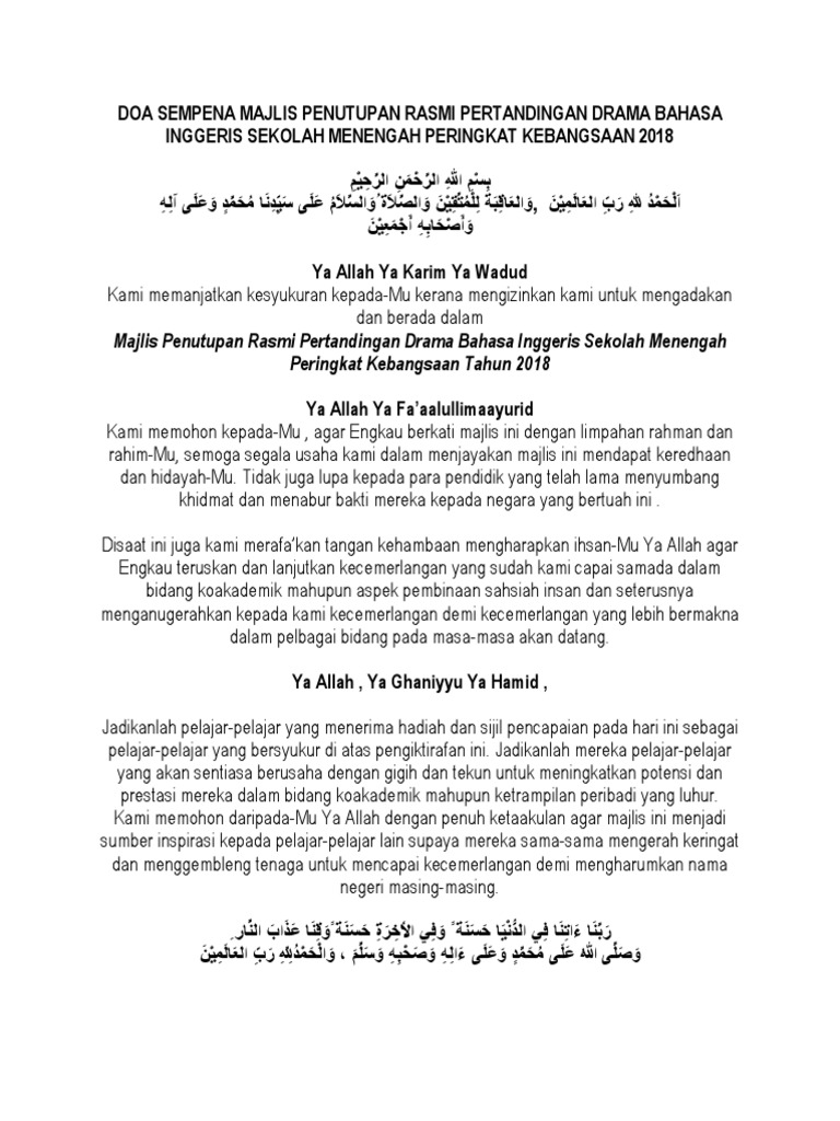 Doa Sempena Majlis Penutupan Rasmi Pertandingan Drama Bahasa Inggeris Sekolah Menengah Peringkat Kebangsaan 2018